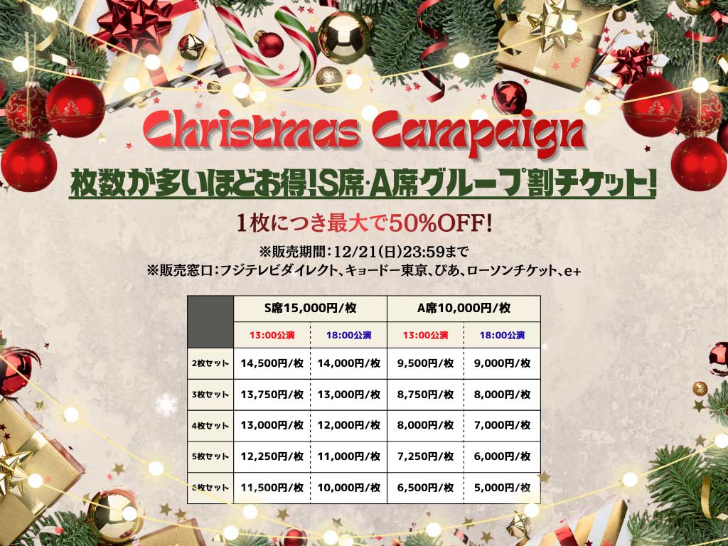 枚数が多いほどお得なS席・A席グループ割チケット販売!1枚につき最大で50%OFF!